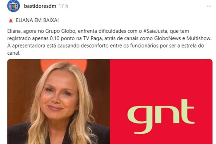 De acordo com informações divulgadas pelo perfil ‘Bastidores da Mídia‘, na plataforma Threads, Eliana enfrenta dificuldades com o ‘Saia Justa’, no GNT. Segundo a publicação, a atração tem registrado apenas 0,10 décimos no ibope na TV Paga, atrás de canais como GloboNews e Multishow.