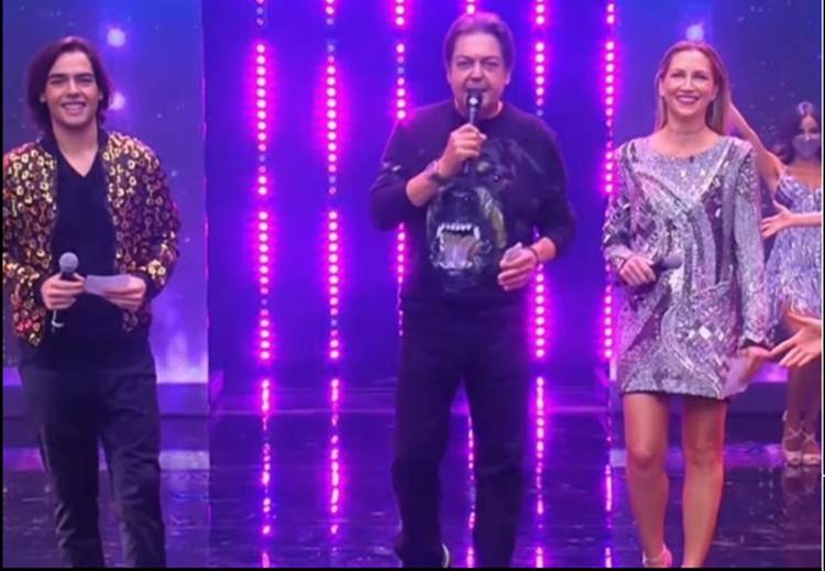Logo no início do programa, o comunicador surgiu no palco ao lado da jornalista Anne Lottermann e de seu filho, João Guilherme Silva, que estreia como apresentador ao lado do pai.