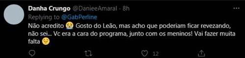 Seguidores do jornalista no Twitter ficaram surpresos com a informação. “Não acredito. Gosto do Leão, mas acho que poderiam ficar revezando, não sei… Vc era a cara do programa junto com os meninos! Vai fazer muita falta”, lamentou uma internauta. “Como assim gente… Bora bater panela la na porta. Poxa vida. Mutio sucesso aonde for! Vc é um excelente profissional, com certeza a porta que se abrirá será aina maior. Sucesso”, desejou outra.