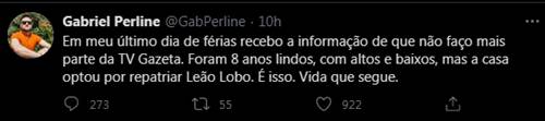 No Twitter, o jornalista lamentou que ficou sabendo de que estaria fora da atração em seu último dia de férias. “Em meu último dia de férias recebo a informação de que não faço mais parte da TV Gazeta. Foram 8 anos lindos, com altos e baixos, mas a casa optou por repatriar Leão Lobo. É isso. Vida que segue”, escreveu no microblog.