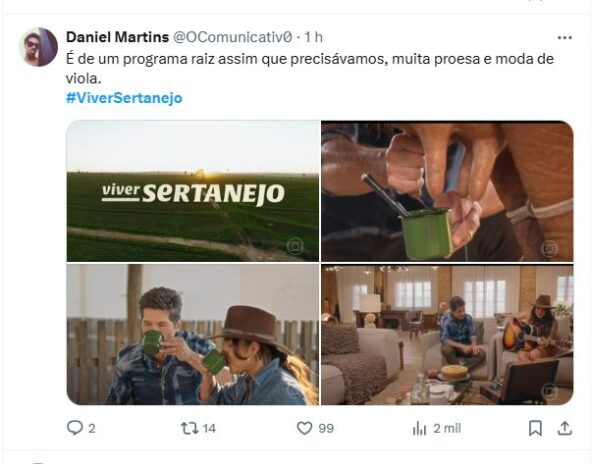 “É de um programa raiz assim que precisávamos, muita proesa e moda de viola. #ViverSertanejo“, elogou outro. “Estou completamente apaixonada nesse programa, presentão para os meus domingos de manhã!! Eu amo sertanejo #ViverSertanejo“, declarou uma terceira internauta no X, (antigo Twitter).