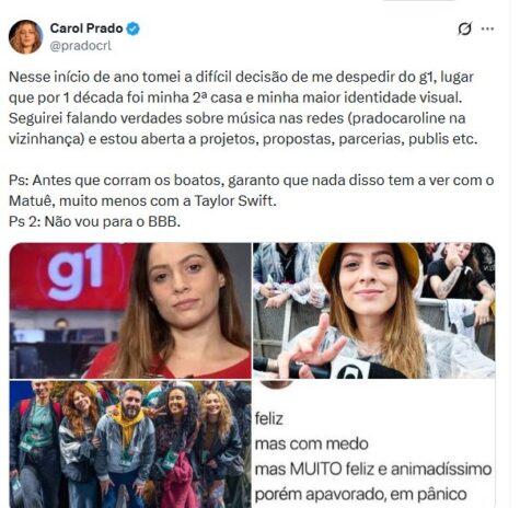 E seguiu: “Seguirei falando verdades sobre música nas redes (pradocaroline na vizinhança) e estou aberta a projetos, propostas, parcerias, publis etc.Ps: Antes que corram os boatos, garanto que nada disso tem a ver com o Matuê, muito menos com a Taylor Swift. Ps 2: Não vou para o BBB“, enfatizou ela.