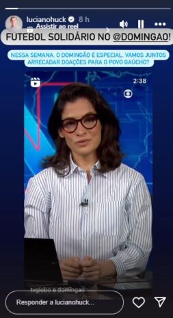 Devido o Brasileirão está suspenso por duas semanas, a Globo não terá conteúdo esportivo para sua grade dominical e, diante disso, Luciano Huck promoverá no Maracanã na próxima semana, um futebol solidário. “Neste domingo, dia 26, o Maracanã vai receber astros em um evento beneficente. O futebol solidário no Domingão vai arrecadar e incentivar doações ao Rio Grande do Sul“, contou Renata.