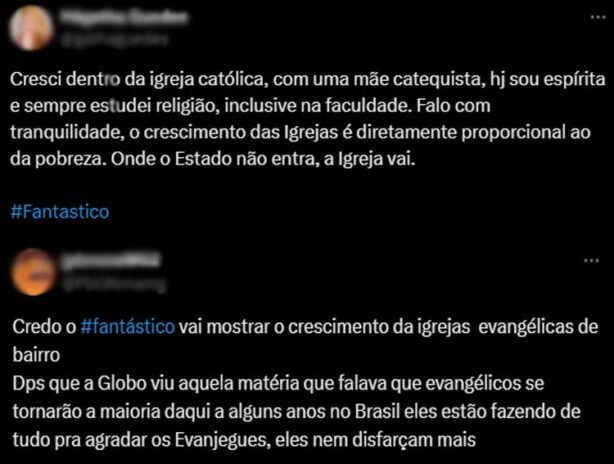 Outra, disse que as igrejas fazem um papel importante no país. “Cresci dentro da Igreja Católica, com uma mãe catequista. Hoje sou espírita e sempre estudei religião, inclusive na faculdade. Falo com tranquilidade: o crescimento das igrejas é diretamente proporcional ao da pobreza. Onde o Estado não entra, a Igreja vai”, afirmou a internauta.