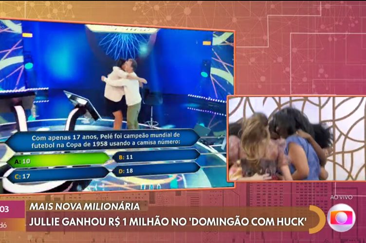 Ao fim de sua participação especial no programa matinal da TV Globo, Patrícia Poeta pediu para a produção exibir o trecho da comemoração dela no ‘Quem Quer Ser Um Milionário’ e, claro, a apresentadora junto com ela e demais convidados, celebraram muito com a conquista da jovem jornalista, pulando muito, assim como ocorreu no ‘Domingão’.