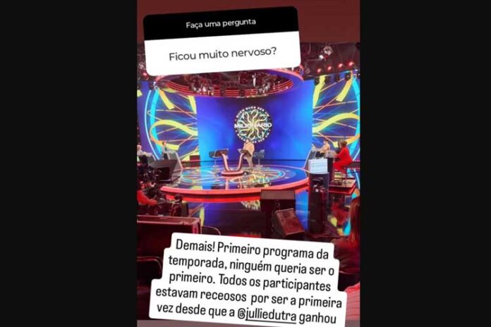 Ao ser questionado sobre o nervosismo no momento da resposta, o ex-jogador de vôlei afirmou ter ficado nervoso em outra pergunta. “Demais! Primeiro programa da temporada, ninguém queria ser o primeiro. Todos os participantes estavam receosos por ser a primeira vez desde que a Juliie Dutra ganhou!”, afirmou.