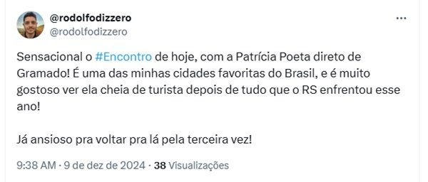 Nas redes sociais, o momento especial foi comentado e elogiado pelo público: “Sensacional o #Encontro de hoje, com a Patrícia Poeta direto de Gramado! É uma das minhas cidades favoritas do Brasil, e é muito gostoso ver ela cheia de turista depois de tudo que o RS enfrentou esse ano! Já ansioso pra voltar pra lá pela terceira vez!“, escreveu um no X.