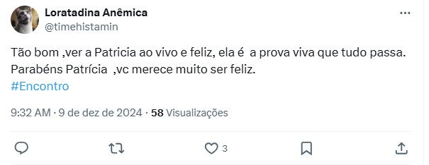 “Gramado passando no #encontro com neblina, pessoas com roupa de frio e aqui em Minas Gerais um calor insuportável … amo isso no Brasil“, reparou outra. “Tão bom, ver a Patrícia ao vivo e feliz, ela é a prova viva que tudo passa. Parabéns Patrícia, vc merece muito ser feliz. #Encontro“, publicou um terceiro.