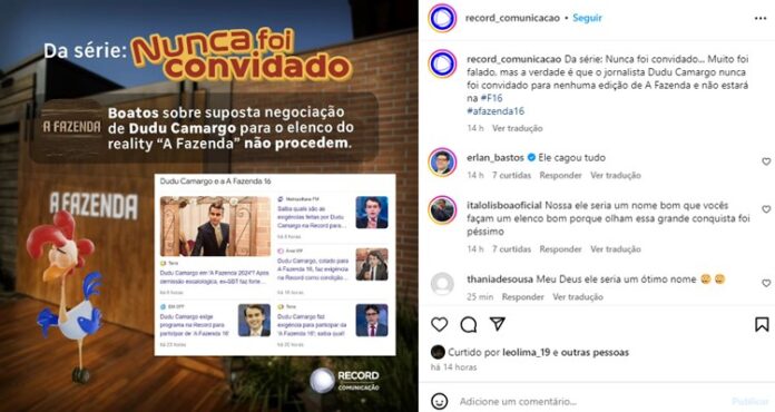 Boatos sobre suposta negociação de Dudu Camargo para o elenco do reality ‘A Fazenda’ não procedem“, inicia a nota. “Da série: Nunca foi convidado… Muito foi falado, mas a verdade é que o jornalista Dudu Camargo nunca foi convidado para nenhuma edição de A Fazenda e não estará na ‘A Fazenda 16’“, informou a Comunicação da emissora pelas redes sociais.