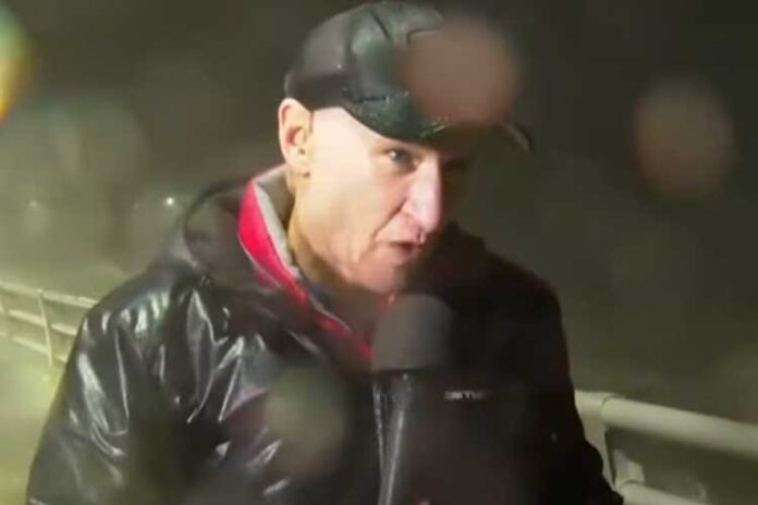 Em vídeo compartilhado pelo canal no Youtube, o profissional mostra os estragos provocados pela tempestade enquanto tenta se manter de pé, com a água na altura dos joelhos.
