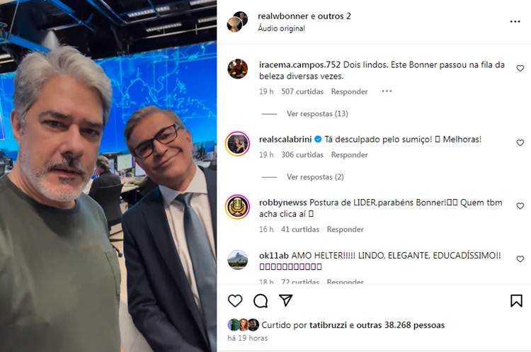 Outros internautas também reagiram ao post. “Tio Bonner é todo lindooooo até sem voz”, afirmou um. “Cuidado, não passe o vírus pro Helter”, brincou outro. “Valeu a satisfação! Eu só assisto ao JN quando você e a Renata estão na bancada! Gosto da interação de vocês dois”, aprovou mais um.