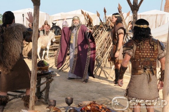 Abner (Iran Malfinato), Esbaal (Daniel Andrade) e Saul (Gracindo Jr.) fazem sua refeição diante de uma mesa farta. O clima é tenso e nenhum deles troca uma palavra sequer. Jonatas (Cláudio Fontana) surge e o rei fica irritado ao vê-lo só, afinal, tinha dado ao filho a missão de trazer Davi (Leonardo Brício) de volta ao acampamento. O soldado toma seu lugar à mesa, sem falar nada. Saul se controla quando se dirige ao filho para dizer que ainda existe um lugar vazio. Jonatas afirma que encontrou Davi, mas, cumprindo o que combinou com o amigo para descobrir as reais intenções do rei, mente que o hebreu foi visitar a família em Belém.