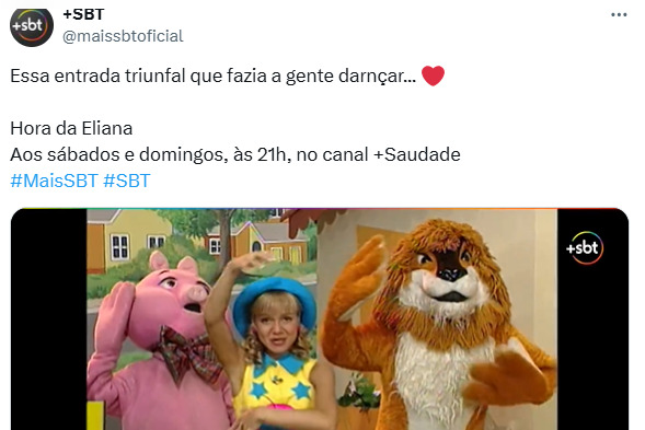 “Essa entrada triunfal que fazia a gente darnçar… Hora da Eliana Aos sábados e domingos, às 21h, no canal +Saudade”, escreveu o perfil do +SBT na publicação de um vídeo, onde Eliana faz a sua entrada triunfal durante a abertura do seu programa infantil na emissora.