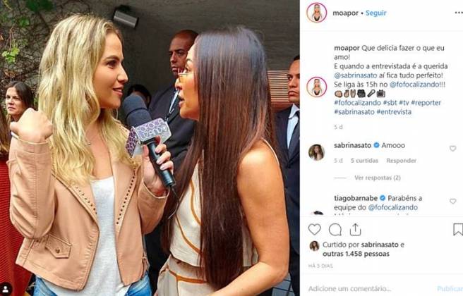 Em seu Instagram, a loira postou um click entrevistando Sabrina Sato já com o microfone do programa: “Que delicia fazer o que eu amo! E quando a entrevistada é a querida @sabrinasato aí fica tudo perfeito!”