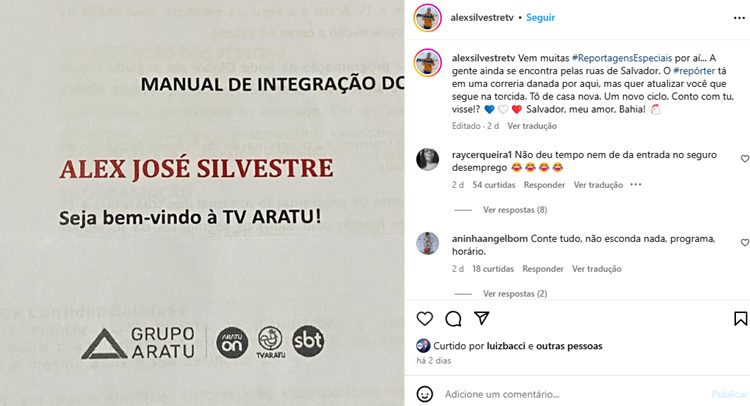 Em outra publicação, Alex confirmou sua chegada ao SBT Bahia (TV Aratu). “Vem muitas reportagens especiais por aí… A gente ainda se encontra pelas ruas de Salvador. O repórter tá em uma correria danada por aqui, mas quer atualizar você que segue na torcida. Tô de casa nova. Um novo ciclo. Conto com tu”, declarou ele, desmontando suas expectativas para o futuro.