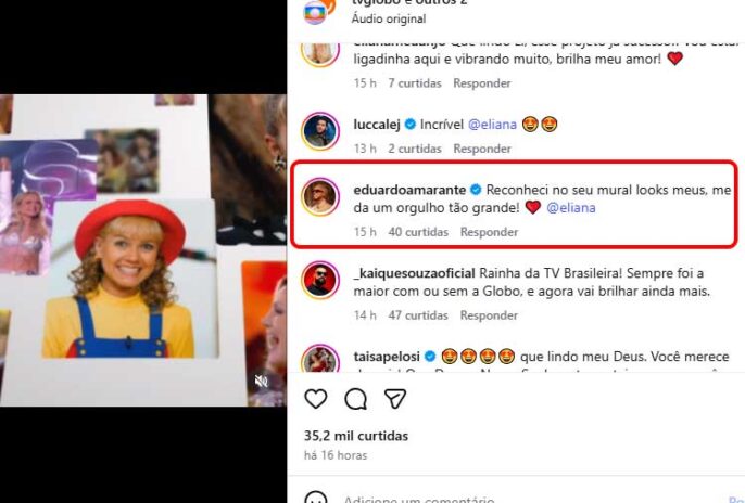 “Reconheci no seu mural looks meus, me dá um orgulho tão grande!”, afirmou. Outros, celebraram o retorno de Eliana às telinhas. “Que legal! Parabéns! Arrebenta! Dá mais audiência q todos os caras!!!!”, celebrou um internauta.”Eliana faz parte da minha história, faz parte do meu crescimento. Quanto amor eu tenho por ela! Muito especial”, disse outro.