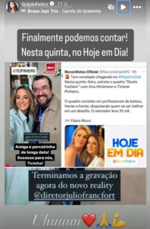 A confirmação ocorreu através do Instagram de Ticiane Pinheiro, que celebrou a novidade: “Uhul”, escreveu ela, inserindo um emoji de coração, gratidão e um braço, demonstrando foco e força. A apresentadora havia repostado o post do diretor Júlio Franco: “Finalmente podemos contar. Nesta quinta, no Hoje em Dia”, escreveu ele.