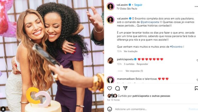“O Encontro completa dois anos em solo paulistano, sob o comando de @patriciapoeta !!! Quantas coisas já vivemos nesse período… Quantas histórias contadas!!! É um prazer levantar todos os dias pra fazer o que amo, cercada por um time que admiro, sabendo que nossa parceria fará toda a diferença pra nós e pra quem nos assiste!!! Que venham mais muitos e muitos anos de #Encontro!“, escreveu ela, ao posar com a apresentadora no feed do Instagram.