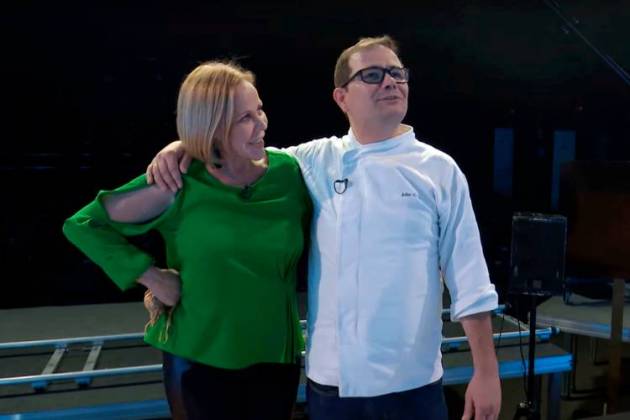 No final do programa Santa Receita, que apresenta de segunda a sexta-feira na TV Aparecida, Claudete Troiano pregou uma peça no chef Julio Cruz. “Vem cá que eu queria falar com você”, disse ela, puxando-o pela mão, saindo do estúdio.