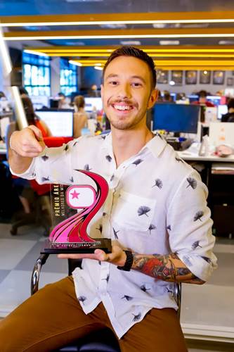 Bacci recebeu a equipe do Área VIP nos estúdios do jornalístico na sede da Record TV em São Paulo, para ser entregue seu troféu.