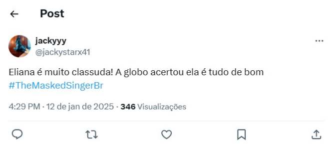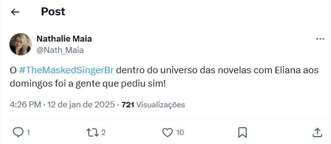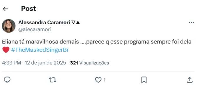“Eliana lindíssima, competente e nitidamente feliz. Fico muito feliz com suas conquistas”, enviou o sexto. “Estreia grandiosa da Eliana. Estreando no  The Masked Singer Br não esperava menos dessa mulher maravilhosa. Sucesso, você é nota mil!”, opinou o sétimo. “O The Masked Singer Br dentro do universo das novelas com Eliana aos domingos foi a gente que pediu sim!”, afirmou a oitava.